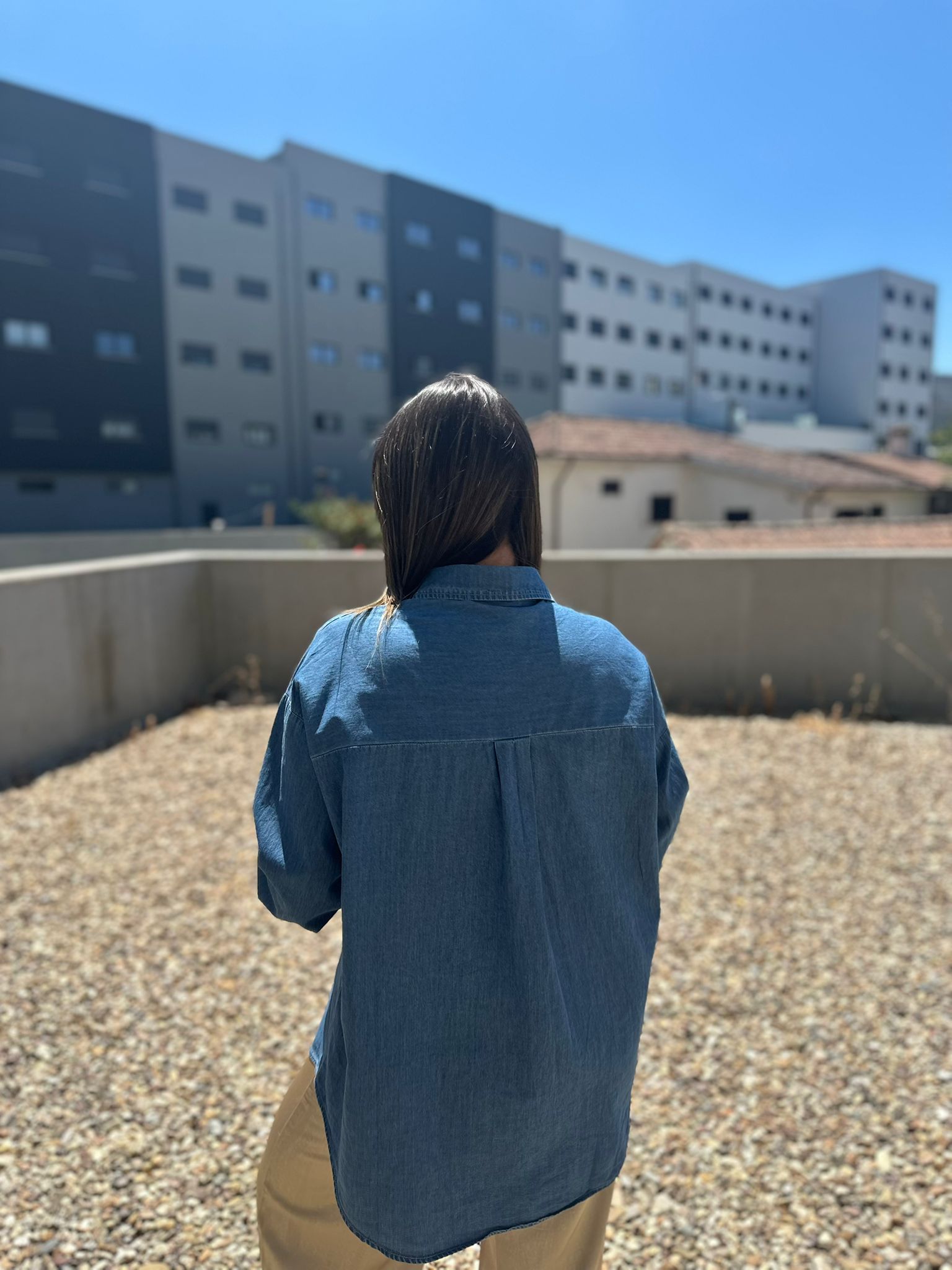 Estilo descontraído com um toque sofisticado. Esta camisa oversized em ganga azul destaca-se pelos detalhes dourados únicos e é perfeita para um look moderno e versátil.
